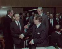 Οι Υπουργοί Βιομηχανίας και Ενέργειας ΚΩΝΣΤΑΝΤΙΝΟΣ ΚΟΝΟΦΑΓΟΣ και Εμπορίου ΙΩΑΝΝΗΣ ΒΑΡΒΙΤΣΙΩΤΗΣ εγκαινιάζουν την Έκθεση μηχανολογικού εξοπλισμού ΙΝΤΕΞ 75 στο Ζάππειο Μέγαρο.