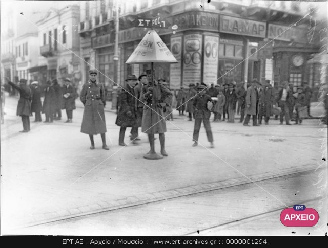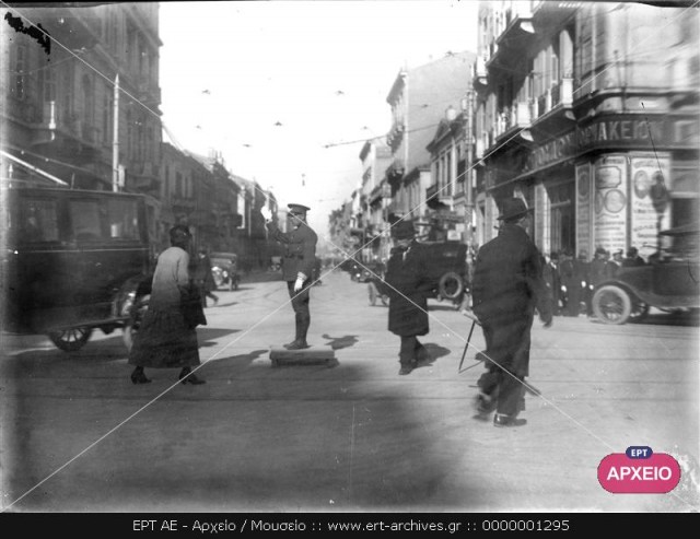 ΑΘΗΝΑ. ΧΩΡΟΦΥΛΑΚΑΣ ΣΤΗ ΣΥΜΒΟΛΗ ΤΩΝ ΟΔΩΝ ΑΙΟΛΟΥ, ΠΑΝΕΠΙΣΤΗΜΙΟΥ ΚΑΙ ΠΑΤΗΣΙΩΝ ΣΤΑ ΧΑΥΤΕΙΑ ΡΥΘΜΙΖΕΙ ΤΗΝ ΚΙΝΗΣΗ ΤΩΝ ΟΧΗΜΑΤΩΝ ΜΕ ΕΝΑ ΜΗΧΑΝΙΣΜΟ ΓΝΩΣΤΟ ΤΟΤΕ ΩΣ ΟΜΠΡΕΛΑ. ΤΟ ΦΑΡΜΑΚΕΙΟ ΤΟΥ ΜΑΡΙΝΟΠΟΥΛΟΥ ΣΤΟ ΒΑΘΟΣ. ΠΛΗΘΟΣ ΠΕΡΑΣΤΙΚΩΝ ΚΙΝΕΙΤΑΙ ΣΤΟ ΔΡΟΜΟ. ΣΤΟ ΟΔΟΣΤΡΩΜΑ ΔΙΑΚΡΙΝΟΝΤΑΙ ΟΙ ΡΑΓΕΣ ΤΟΥ ΤΡΑΜ.