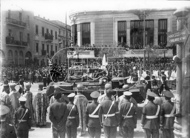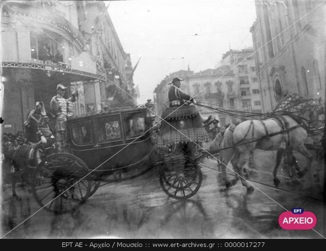 Η βασιλική άμαξα στη διασταύρωση των οδών Μητροπόλεως και Ευαγγελιστρίας, κατευθύνεται προς την Μητρόπολη Αθηνών, την ημέρα των γάμων της πριγκίπισσας ΦΡΕΙΔΕΡΙΚΗΣ με τον διάδοχο ΠΑΥΛΟ.