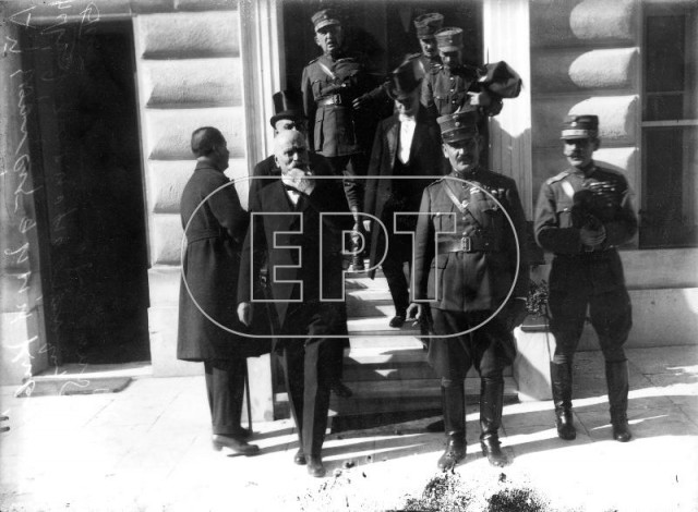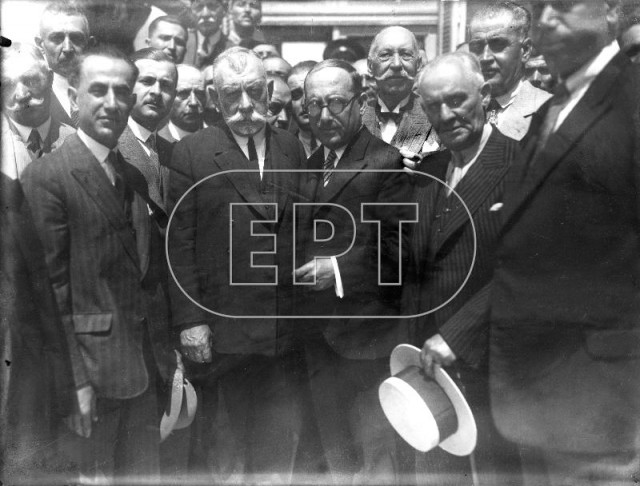 ΑΘΗΝΑ. ΤΑ ΜΕΛΗ ΤΗΣ ΕΠΑΝΑΣΤΑΤΙΚΗΣ ΚΥΒΕΡΝΗΣΗΣ ΤΟΥ 1922 ΕΞΕΡΧΟΝΤΑΙ ΑΠΟ ΤΗΝ ΠΑΛΑΙΑ ΒΟΥΛΗ. ΑΝΑΜΕΣΑ ΤΟΥΣ ΔΙΑΚΡΙΝΕΤΑΙ Ο ΣΤΥΛΙΑΝΟΣ ΓΟΝΑΤΑΣ ΚΑΙ Ο ΣΩΤΗΡΗΣ ΚΡΟΚΙΔΑΣ.