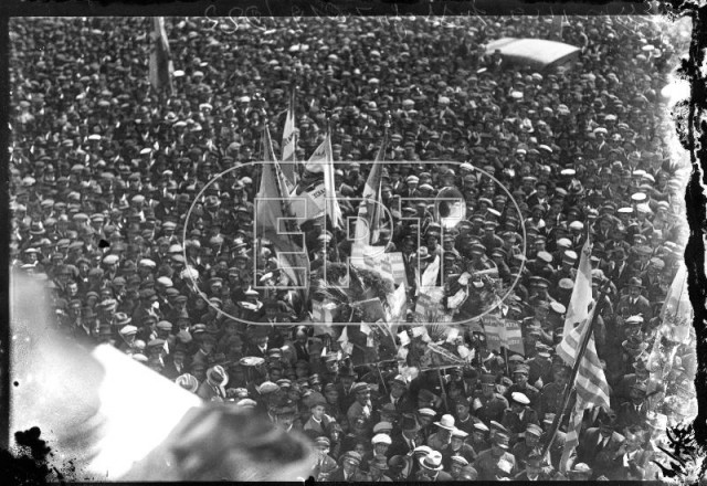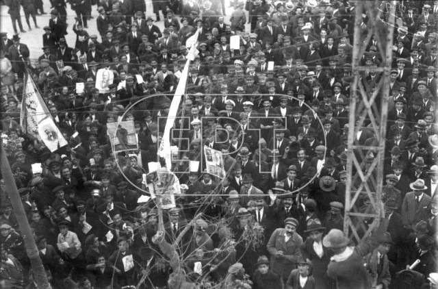 ΑΘΗΝΑ Η ΠΕΙΡΑΙΑΣ. ΣΤΙΓΜΙΟΤΥΠΟ ΑΠΟ ΤΗ ΣΥΓΚΕΝΤΡΩΣΗ ΤΩΝ ΟΠΑΔΩΝ ΤΟΥ ΚΟΜΜΑΤΟΣ ΤΗΣ ΔΗΜΟΚΡΑΤΙΚΗΣ ΕΝΩΣΗΣ ΤΟΥ ΑΛΕΞΑΝΔΡΟΥ ΠΑΠΑΝΑΣΤΑΣΙΟΥ. ΔΙΑΚΡΙΝΟΝΤΑΙ ΣΗΜΑΙΕΣ, ΠΑΝΟ ΜΕ ΣΥΝΘΗΜΑΤΑ ΚΑΙ ΠΟΡΤΡΕΤΟ ΤΟΥ ΑΛΕΞΑΝΔΡΟΥ ΠΑΠΑΝΑΣΤΑΣΙΟΥ.