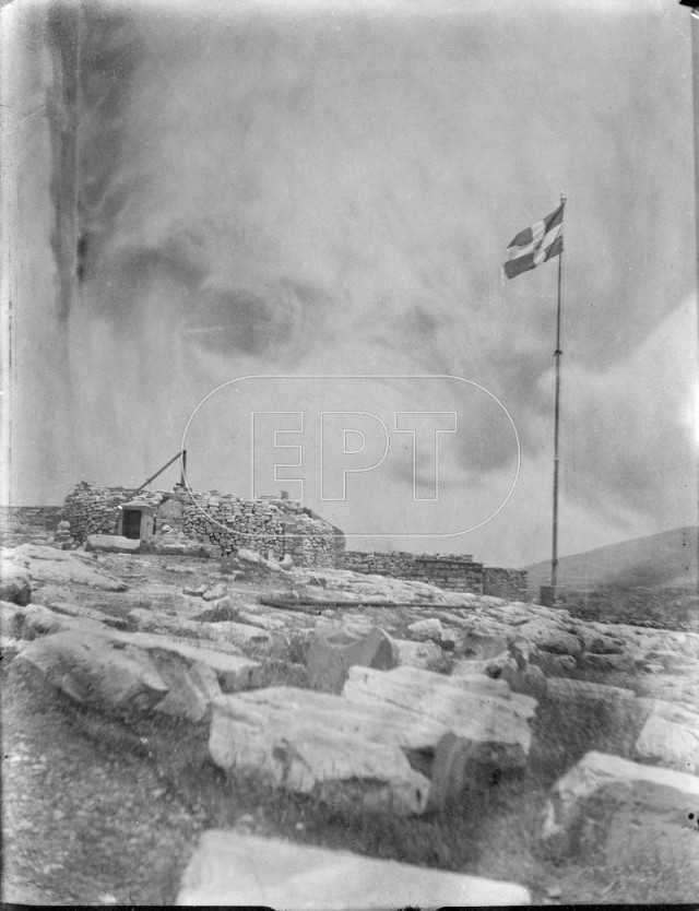 ΑΘΗΝΑ. ΑΠΟΨΗ ΤΟΥ ΙΕΡΟΥ ΒΡΑΧΟΥ ΤΗΣ ΑΚΡΟΠΟΛΗΣ ΜΕ ΤΗΝ ΕΛΛΗΝΙΚΗ ΣΗΜΑΙΑ ΝΑ ΚΥΜΑΤΙΖΕΙ ΠΡΙΝ ΥΠΟΣΤΑΛΕΙ ΚΑΙ ΥΨΩΘΕΙ Η ΓΕΡΜΑΝΙΚΗ.