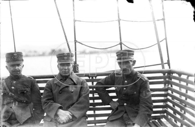 ΑΝΤΕΠΑΝΑΣΤΑΣΗ (ΚΙΝΗΜΑ ΛΕΟΝΑΡΔΟΠΟΥΛΟΥ-ΓΑΡΓΑΛΙΔΗ) ΕΝΑΝΤΙΟΝ ΤΟΥ ΚΙΝΗΜΑΤΟΣ ΤΟΥ 1922. ΟΙ ΣΥΛΛΗΦΘΕΝΤΕΣ ΑΞΙΩΜΑΤΙΚΟΙ ΠΑΝΩ ΣΤΟ ΠΛΟΙΟ-ΚΡΑΤΗΤΗΡΙΟ ΜΕΤΑΦΕΡΟΝΤΑΙ ΣΤΗΝ ΕΛΕΥΣΙΝΑ. ΔΙΑΚΡΙΝΕΤΑΙ Ο ΠΑΝΑΓΙΩΤΗΣ ΓΑΡΓΑΛΙΔΗΣ (ΣΤΗ ΜΕΣΗ) ΚΑΙ ΔΙΠΛΑ ΤΟΥ (ΑΠΟ ΔΕΞΙΑ) Ο ΓΕΩΡΓΙΟΣ ΛΕΟΝΑΡΔΟΠΟΥΛΟΣ (ΣΥΜΦΩΝΑ ΜΕ ΣΗΜΕΙΩΣΗ ΤΟΥ ΦΩΤΟΓΡΑΦΟΥ).